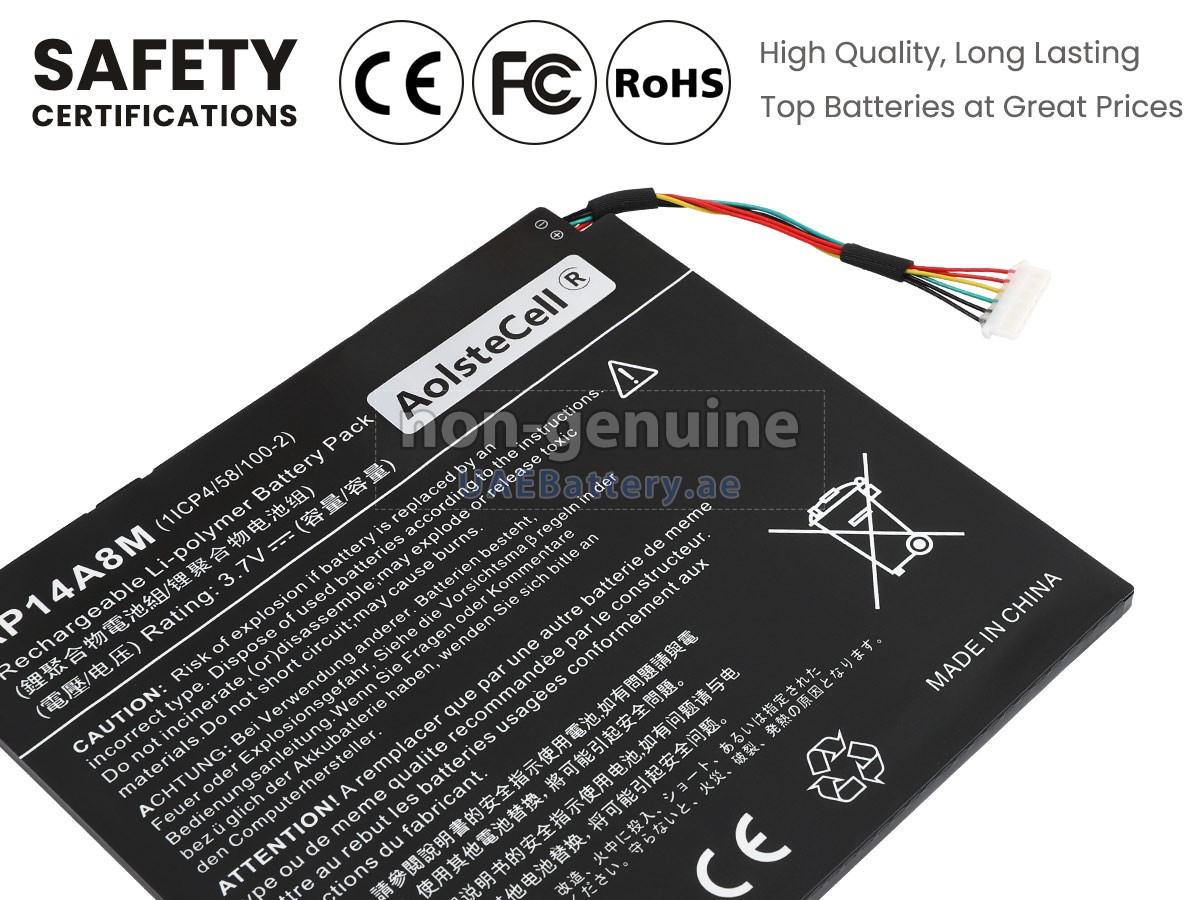 اجتازت كل بطارية Acer SWITCH 10 SW5-012-10QZ مستبدلة سلسلة من شهادات السلامة مثل ECAS، CE، UL والخ، وبالإضافة إلى ذلك، يلزم أن تخضع لسلسلة من الإختبارات الصارمة قبل خروجها من المصنع لحماية استخدامكم الآمن!