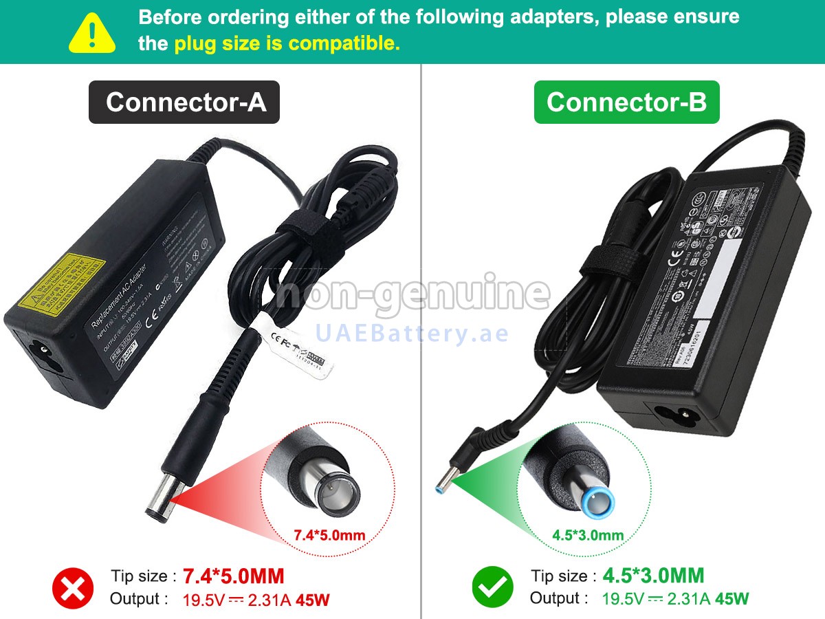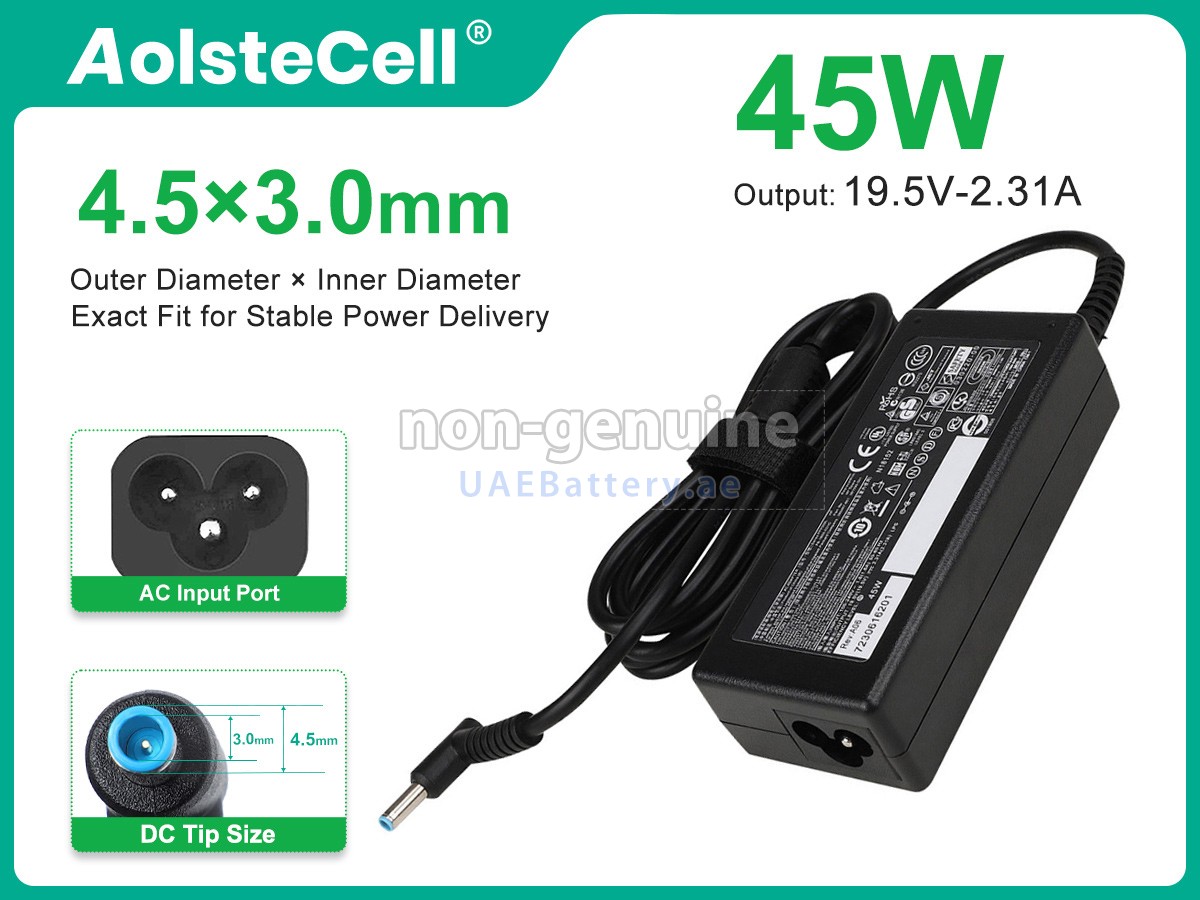 جواب: ركز فقط على معلمات الإخراج ونوع الموصل (أو الحجم). يجب أن يكون جهد الإخراج هو نفسه جهد المحول الأصلي أو في حدود 1 فولت، ويجب أن يكون تيار الإخراج أكبر قليلاً من أو يساوي محول التيار المتردد الأصلي لجهاز HP 45W 19.5V-2.31A 100-240V~1.5A 50/60HZ. أما بالنسبة لنوع الموصل، فتأكد من إمكانية توصيله بمنفذ الشحن بجهازك. إذا لم تتمكن من تحديد حجم الموصل، فيرجى الاتصال بنا لإخبارنا بطراز جهازك.