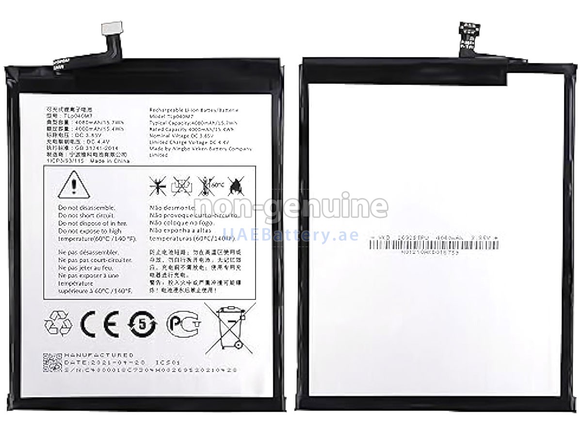 اجتازت كل بطارية Alcatel TLP040M7 مستبدلة سلسلة من شهادات السلامة مثل ECAS، CE، UL والخ، وبالإضافة إلى ذلك، يلزم أن تخضع لسلسلة من الإختبارات الصارمة قبل خروجها من المصنع لحماية استخدامكم الآمن!