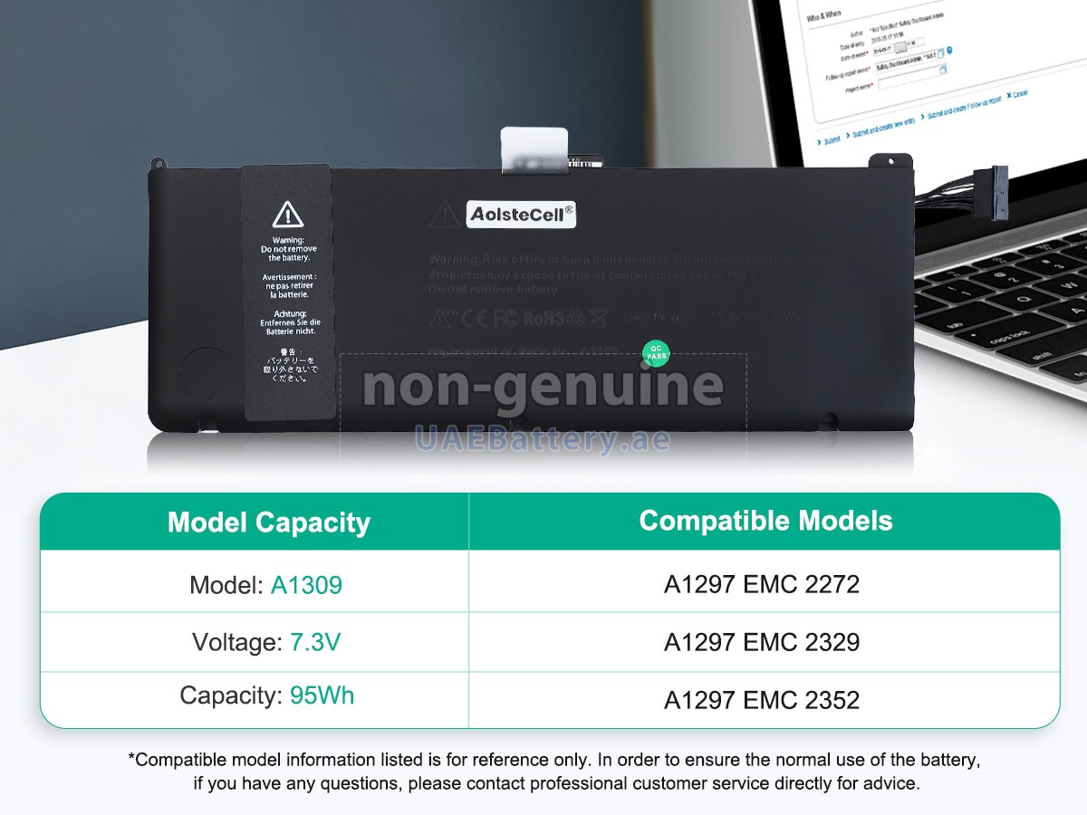 تتوافق البطارية Apple MacBook Pro Core 2 DUO 2.8GHZ 17 inch A1297(EMC 2329*) المستبدلة مع مواصفات الشركة المصنعة الأصلية ومتوافقة مع جهاز Apple الخاص بك بنسبة١٠٠٪، ويمكن أن تنافس أو تتجاوز بطارية MacBook Pro Core 2 DUO 2.8GHZ 17 inch A1297(EMC 2329*) الأصلية في الأداء وتجرية الإستخدام.