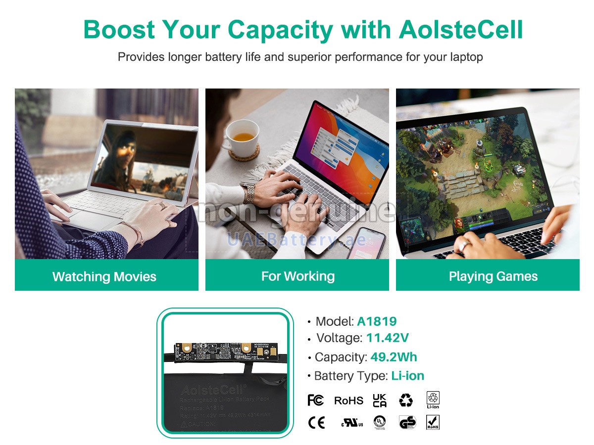 تتميز هذه البطارية Apple MacBook Pro Core I7 3.5 13 inch TOUCH A1706(Mid 2017) المستبدلة بالمزايا التالية: