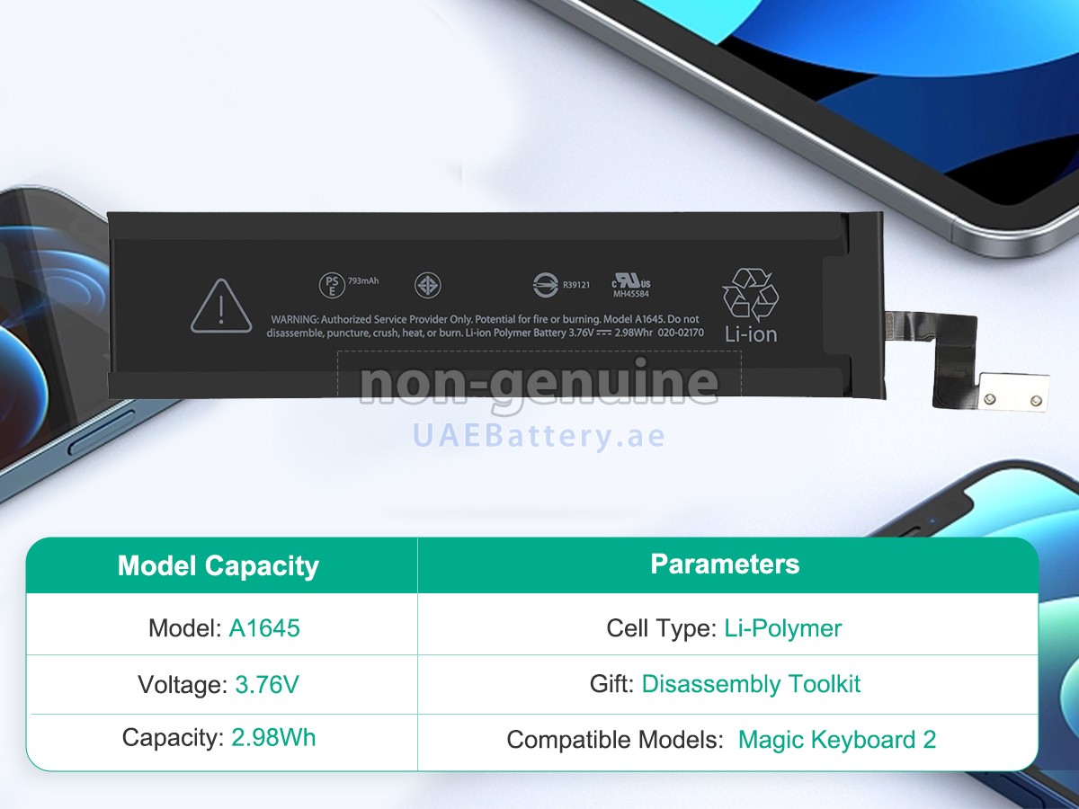اجتازت كل بطارية Apple MAGIC KEYBOARD 2 مستبدلة سلسلة من شهادات السلامة مثل ECAS، CE، UL والخ، وبالإضافة إلى ذلك، يلزم أن تخضع لسلسلة من الإختبارات الصارمة قبل خروجها من المصنع لحماية استخدامكم الآمن!