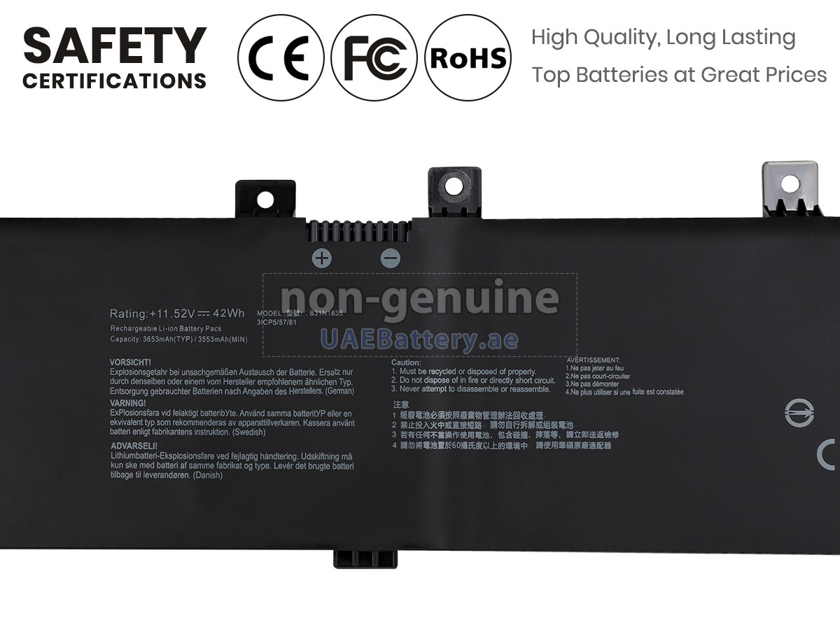 اجتازت كل بطارية Asus VivoBook 17 X705QA-BX027T مستبدلة سلسلة من شهادات السلامة مثل ECAS، CE، UL والخ، وبالإضافة إلى ذلك، يلزم أن تخضع لسلسلة من الإختبارات الصارمة قبل خروجها من المصنع لحماية استخدامكم الآمن!