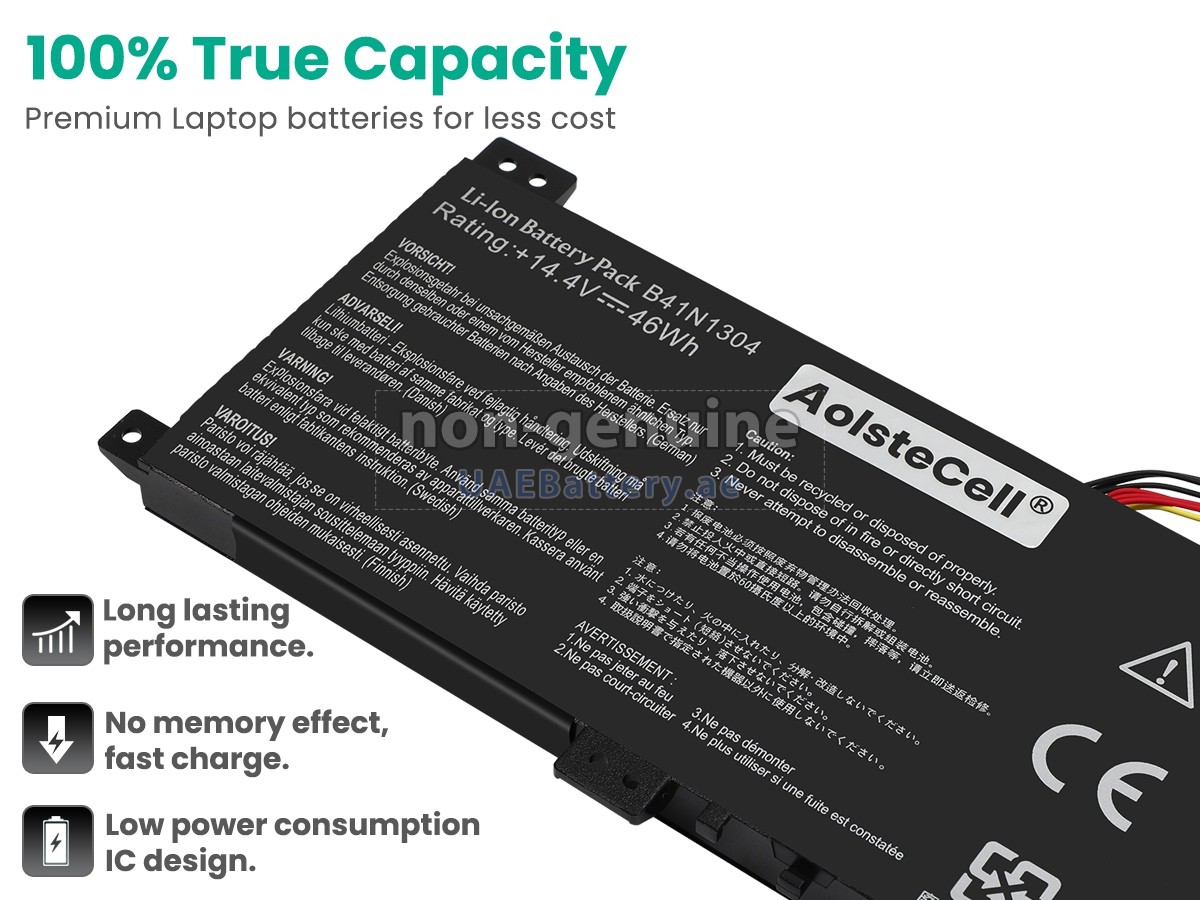 اجتازت كل بطارية Asus VivoBook A451LB مستبدلة سلسلة من شهادات السلامة مثل ECAS، CE، UL والخ، وبالإضافة إلى ذلك، يلزم أن تخضع لسلسلة من الإختبارات الصارمة قبل خروجها من المصنع لحماية استخدامكم الآمن!