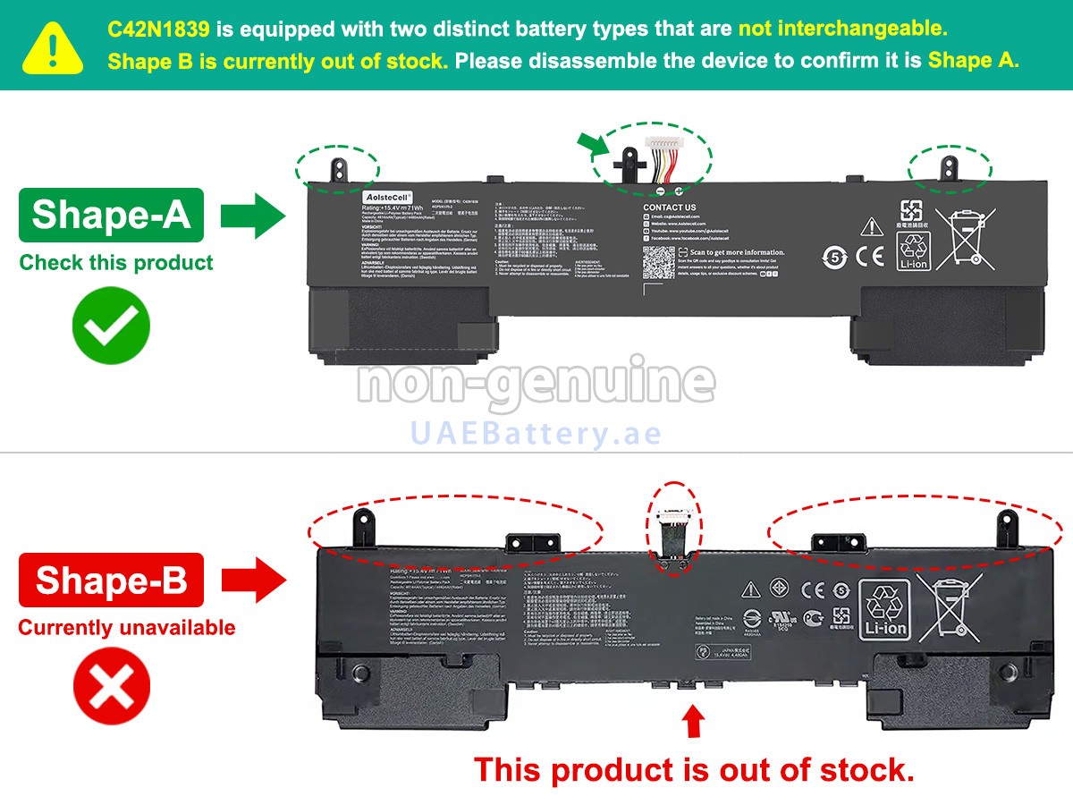 2قم بمقارنة الجهد والسعة للبطارية مع بطارية Asus ZenBook Flip 15 UX563FD-A1027T، وتحقق من أن واجهة البطارية وشكلها هما نفس الصور الموجودة على موقعنا.