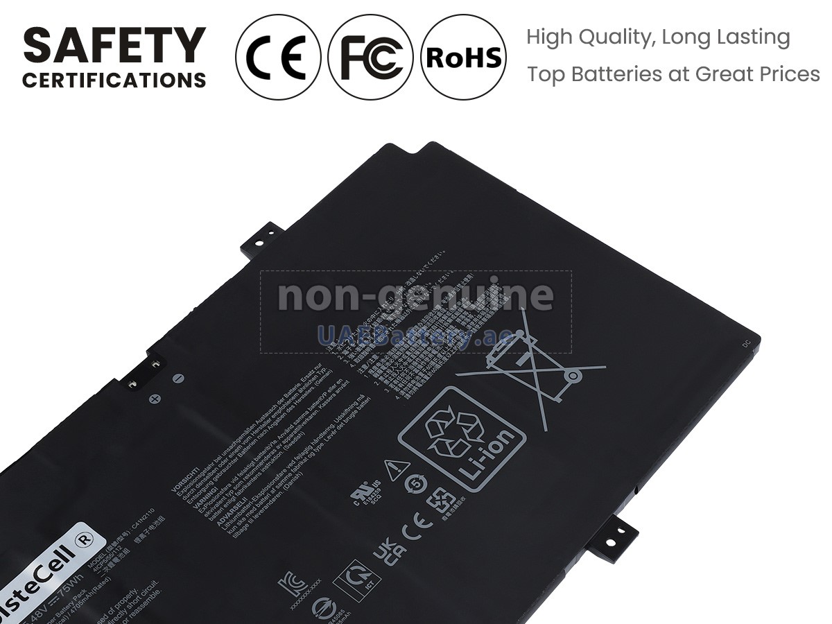 اجتازت كل بطارية Asus ZenBook UX9702AA-FOLED711 مستبدلة سلسلة من شهادات السلامة مثل ECAS، CE، UL والخ، وبالإضافة إلى ذلك، يلزم أن تخضع لسلسلة من الإختبارات الصارمة قبل خروجها من المصنع لحماية استخدامكم الآمن!