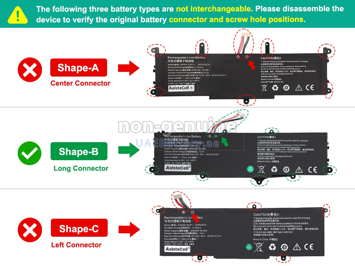 2قم بمقارنة الجهد والسعة للبطارية مع بطارية CHUWI 505979-3S1P-1(3ICP5/59/79)، وتحقق من أن واجهة البطارية وشكلها هما نفس الصور الموجودة على موقعنا.
