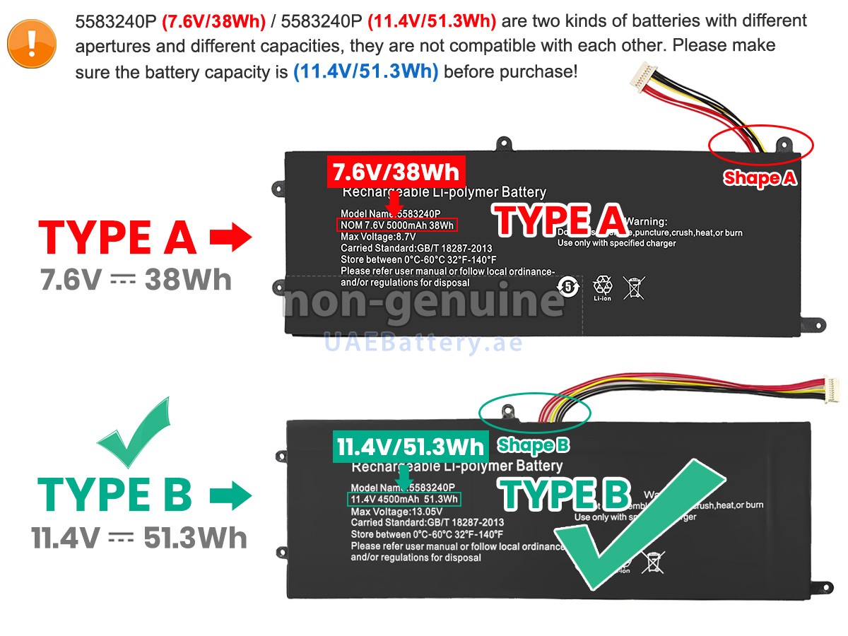 2قم بمقارنة الجهد والسعة للبطارية مع بطارية Cooyes 5583240P، وتحقق من أن واجهة البطارية وشكلها هما نفس الصور الموجودة على موقعنا.