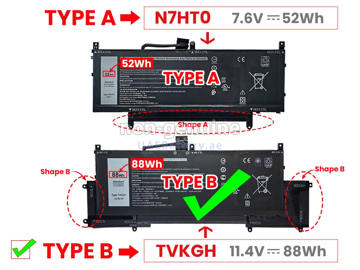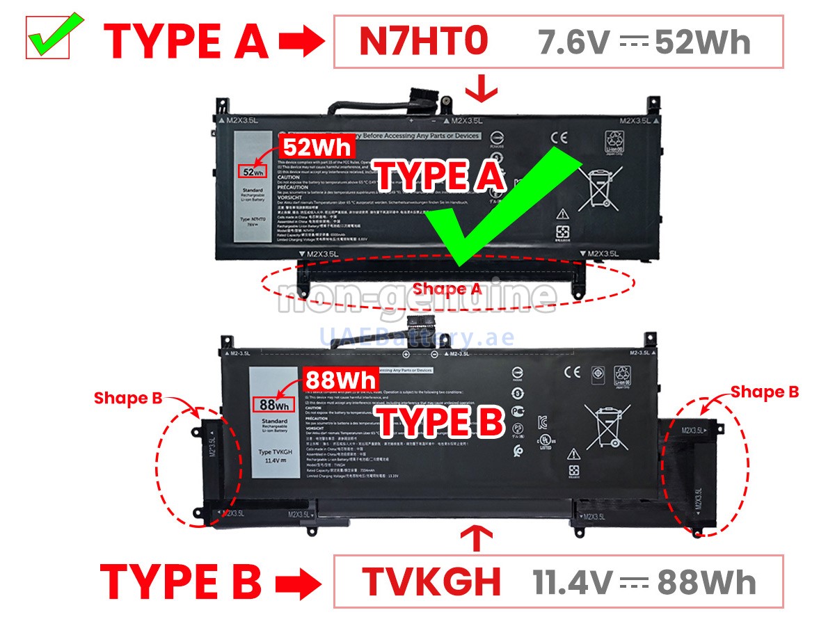 2قم بمقارنة الجهد والسعة للبطارية مع بطارية Dell N7HTO، وتحقق من أن واجهة البطارية وشكلها هما نفس الصور الموجودة على موقعنا.