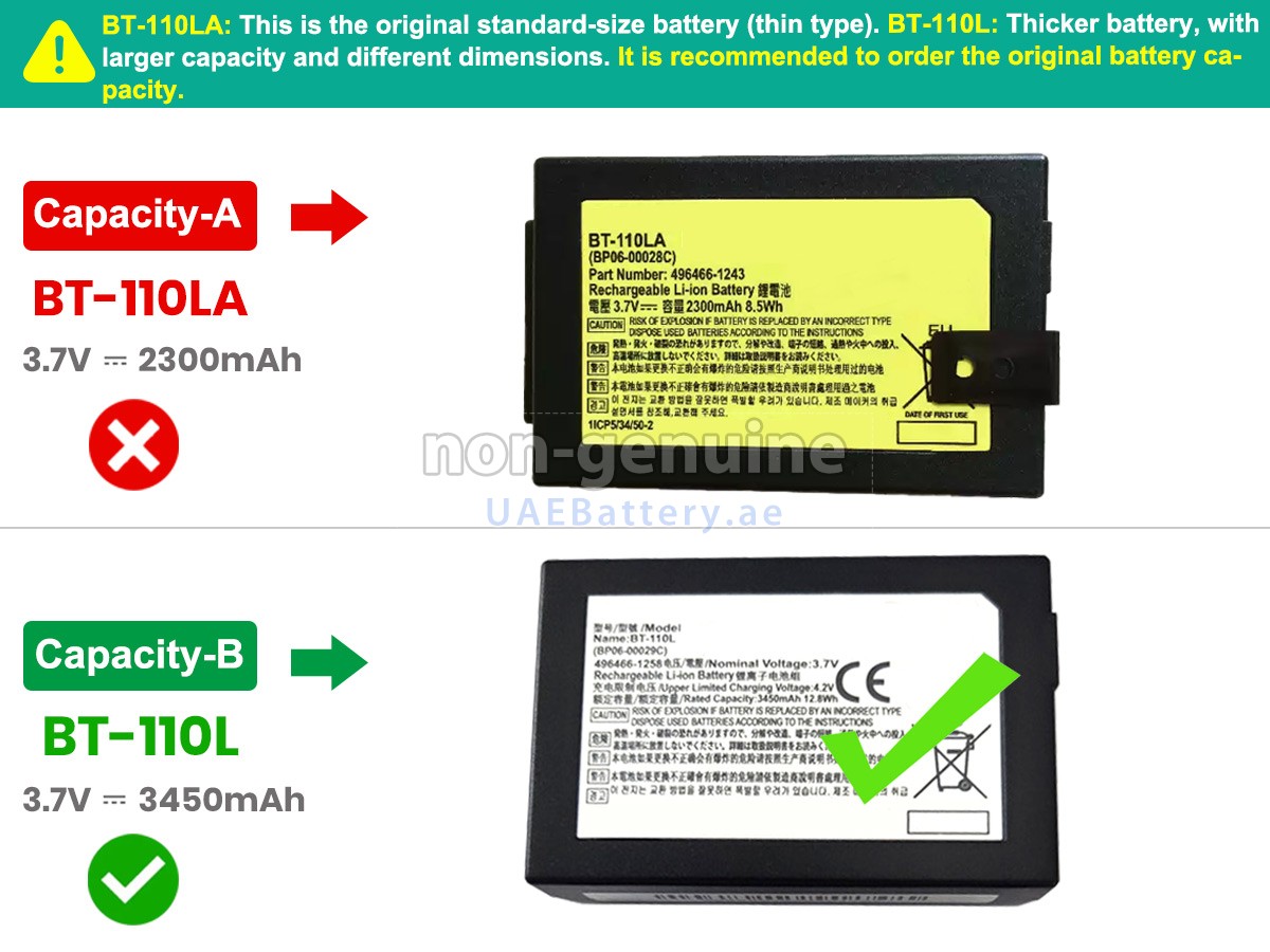 جواب: جميع البطاريات التي تباع على UAEBattery هي بطاريات مستبدل لـOEM. ويستخدم خلايا البطارية والرقائق الذكية من العلامة التجارية الأصلية، ويمكن أن تنافس أو تتجاوز البطارية الأصلية في الأداء وتجرية الإستخدام. وهكذا يتم التخلص من قسط العلامة التجارية ولا تتأثر الجودة. في الواقع، يتم أيضا عملية التجميع لبطارية BT-170LA-C الأصلية باستخدام ملحقات من الطرف الثالث المختلفة، وقامت بتثبيت علامتها التجارية الخاصة بها على البطارية قبل البيع فقط. ففي UAEBattery يمكنكم شراء منتجات عالية الجودة بأسعار معقولة!