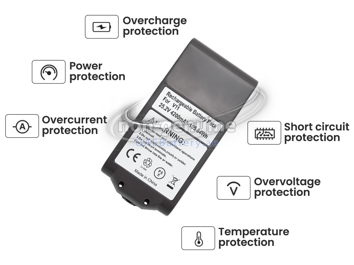 اجتازت كل بطارية Dyson V11 CORDLESS VACUUM CLEANER مستبدلة سلسلة من شهادات السلامة مثل ECAS، CE، UL والخ، وبالإضافة إلى ذلك، يلزم أن تخضع لسلسلة من الإختبارات الصارمة قبل خروجها من المصنع لحماية استخدامكم الآمن!