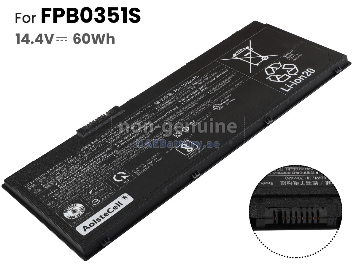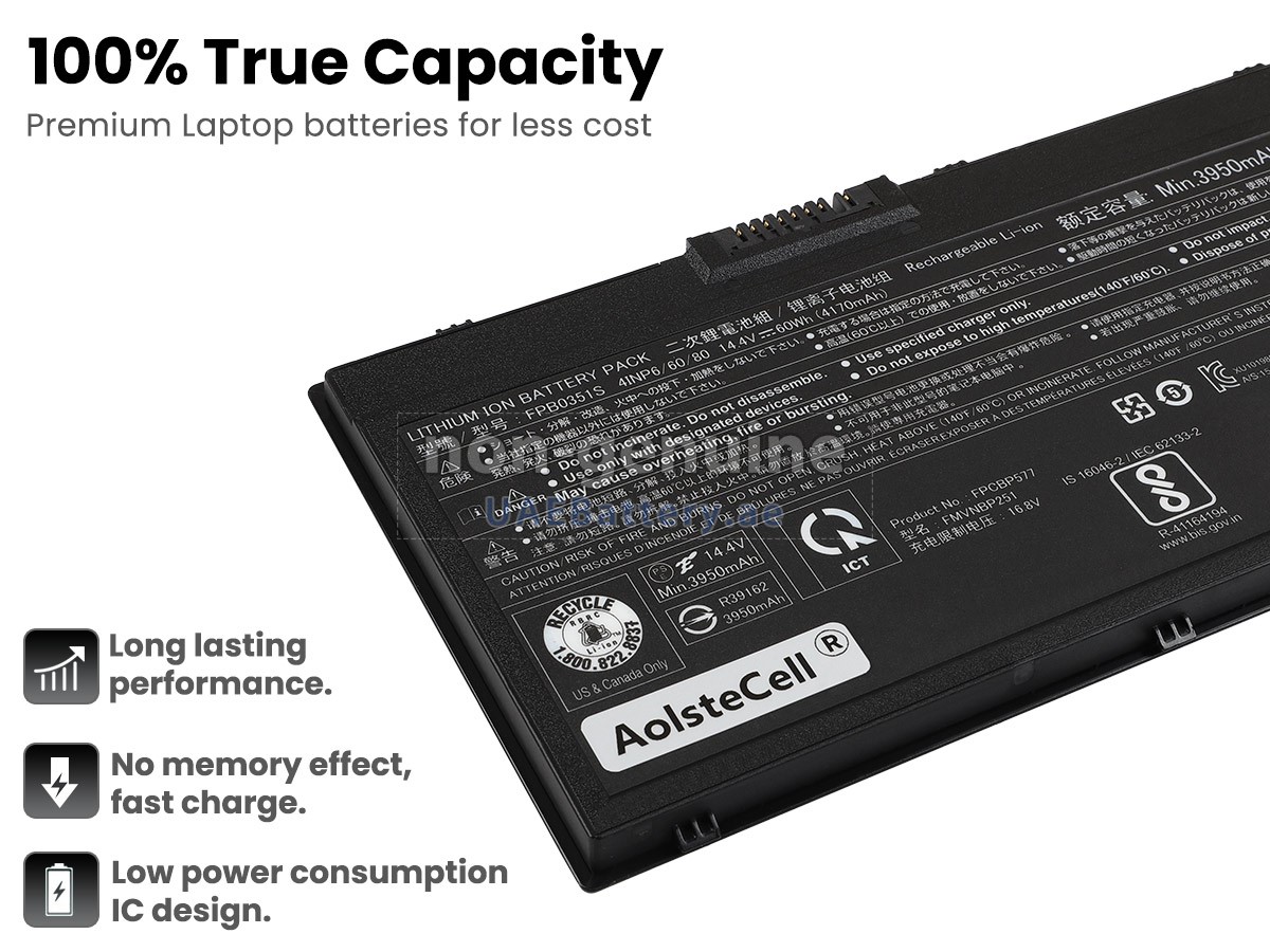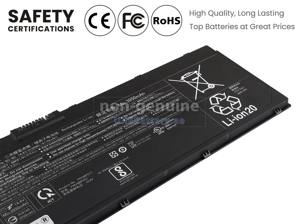 اجتازت كل بطارية Fujitsu FPB03515 مستبدلة سلسلة من شهادات السلامة مثل ECAS، CE، UL والخ، وبالإضافة إلى ذلك، يلزم أن تخضع لسلسلة من الإختبارات الصارمة قبل خروجها من المصنع لحماية استخدامكم الآمن!
