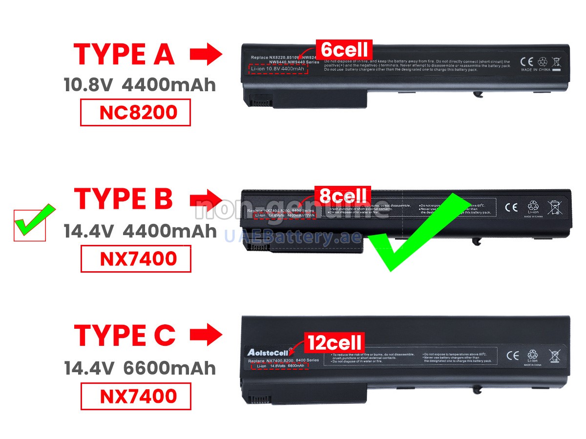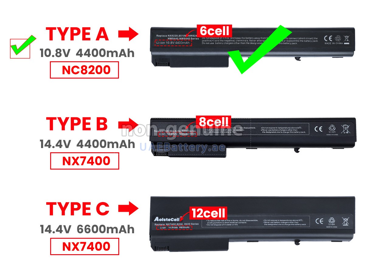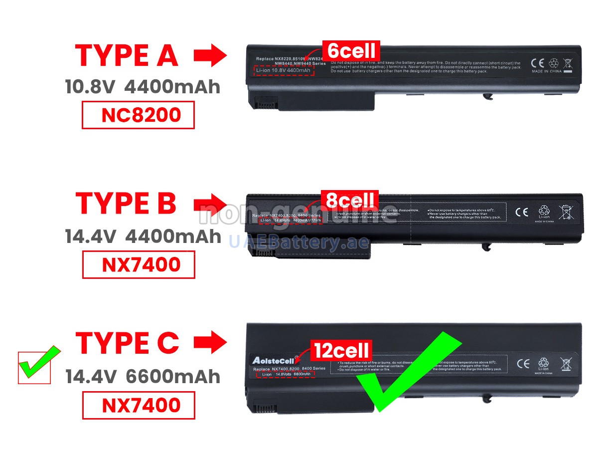 2قم بمقارنة الجهد والسعة للبطارية مع بطارية HP Compaq Business Notebook NC8210، وتحقق من أن واجهة البطارية وشكلها هما نفس الصور الموجودة على موقعنا.