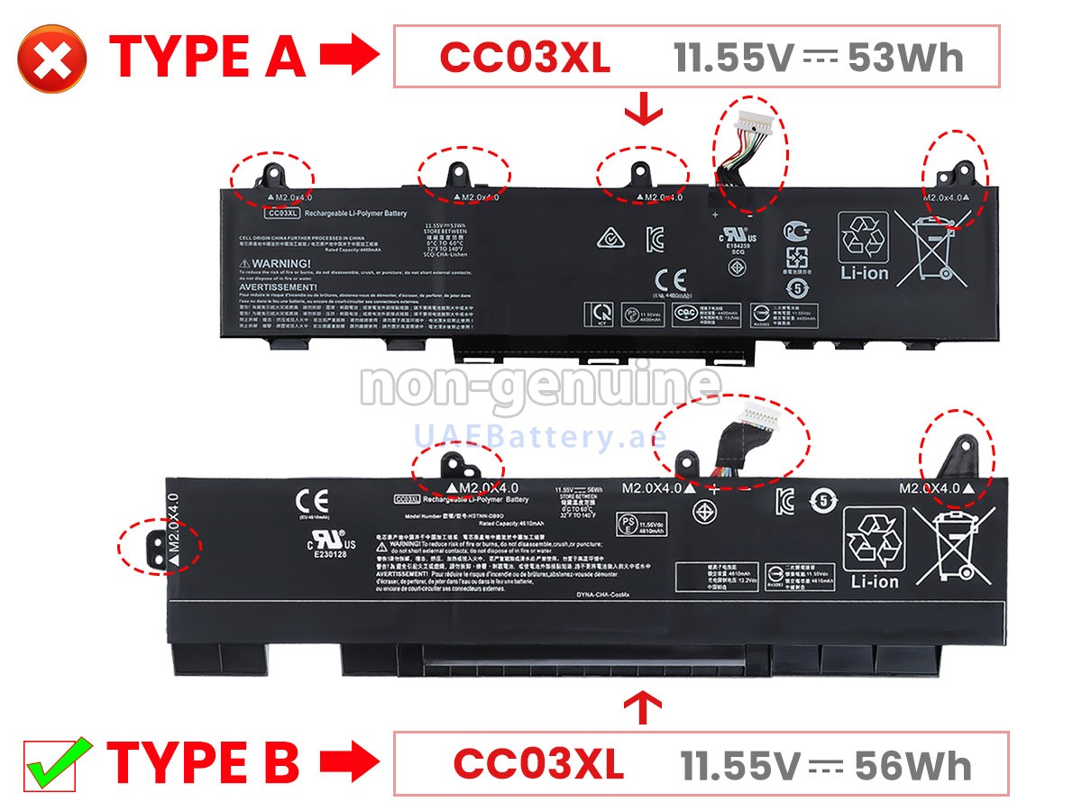 2قم بمقارنة الجهد والسعة للبطارية مع بطارية HP HSTNN-DB9O، وتحقق من أن واجهة البطارية وشكلها هما نفس الصور الموجودة على موقعنا.