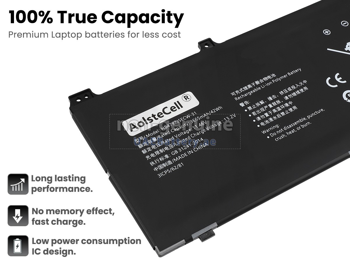 تستخدم كل بطارية Huawei MAGICBOOK X 15 Series مستبدلة الخلايا من بطاريات الليثيوم أيون عالية الجودة من الدرجة A+ من الشركات المصنعة الأصلية مثل Samsung وPanasonic وLG والخ، ورقائق لوحة الدوائر الذكية ومواد ABS+PC الصديقة للبيئة مع وظائف مقاومة درجات الحرارة العالية ومقاومة التآكل، مما يمكن ضمان الأداء العالي وتحسين الأمان بشكل كبير في نفس الوقت.