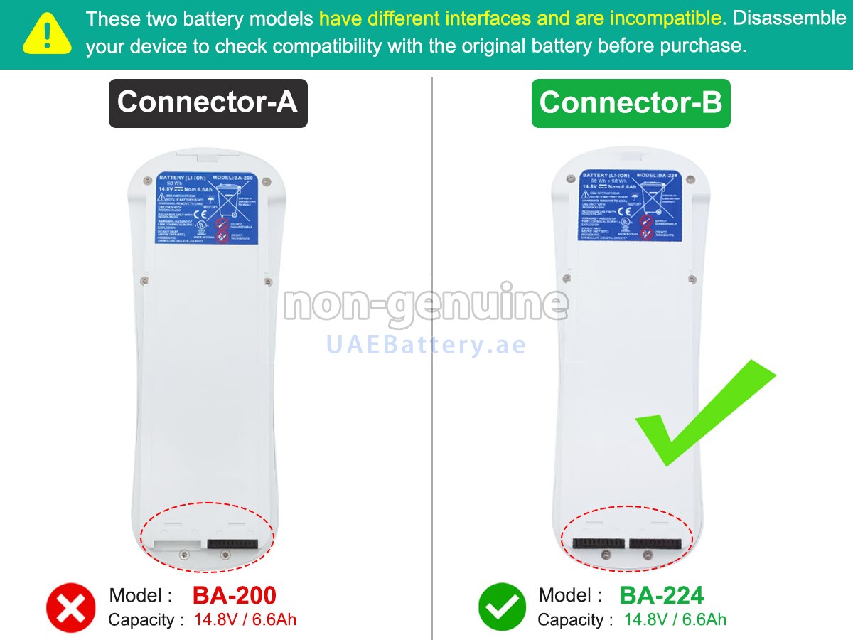 2قم بمقارنة الجهد والسعة للبطارية مع بطارية Inogen ONE G2 PORTABLE OXYGEN CONCENTRATOR، وتحقق من أن واجهة البطارية وشكلها هما نفس الصور الموجودة على موقعنا.