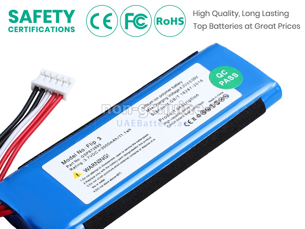 اجتازت كل بطارية JBL FLIP 3 PORTABLE SPEAKER مستبدلة سلسلة من شهادات السلامة مثل ECAS، CE، UL والخ، وبالإضافة إلى ذلك، يلزم أن تخضع لسلسلة من الإختبارات الصارمة قبل خروجها من المصنع لحماية استخدامكم الآمن!