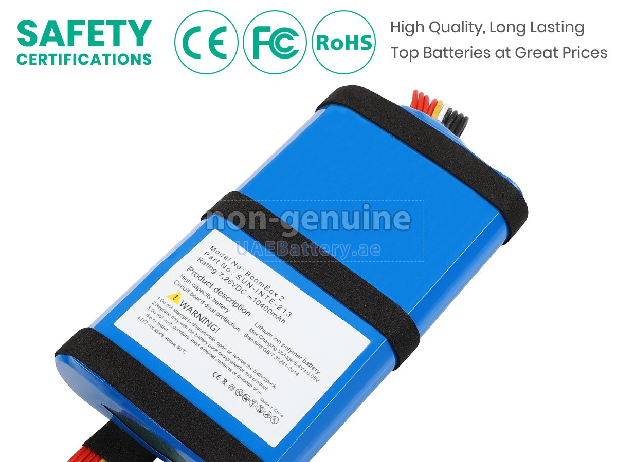 تتوافق البطارية JBL SUN-INTE-213 المستبدلة مع مواصفات الشركة المصنعة الأصلية ومتوافقة مع جهاز JBL الخاص بك بنسبة١٠٠٪، ويمكن أن تنافس أو تتجاوز بطارية SUN-INTE-213 الأصلية في الأداء وتجرية الإستخدام.