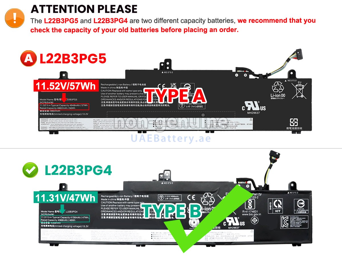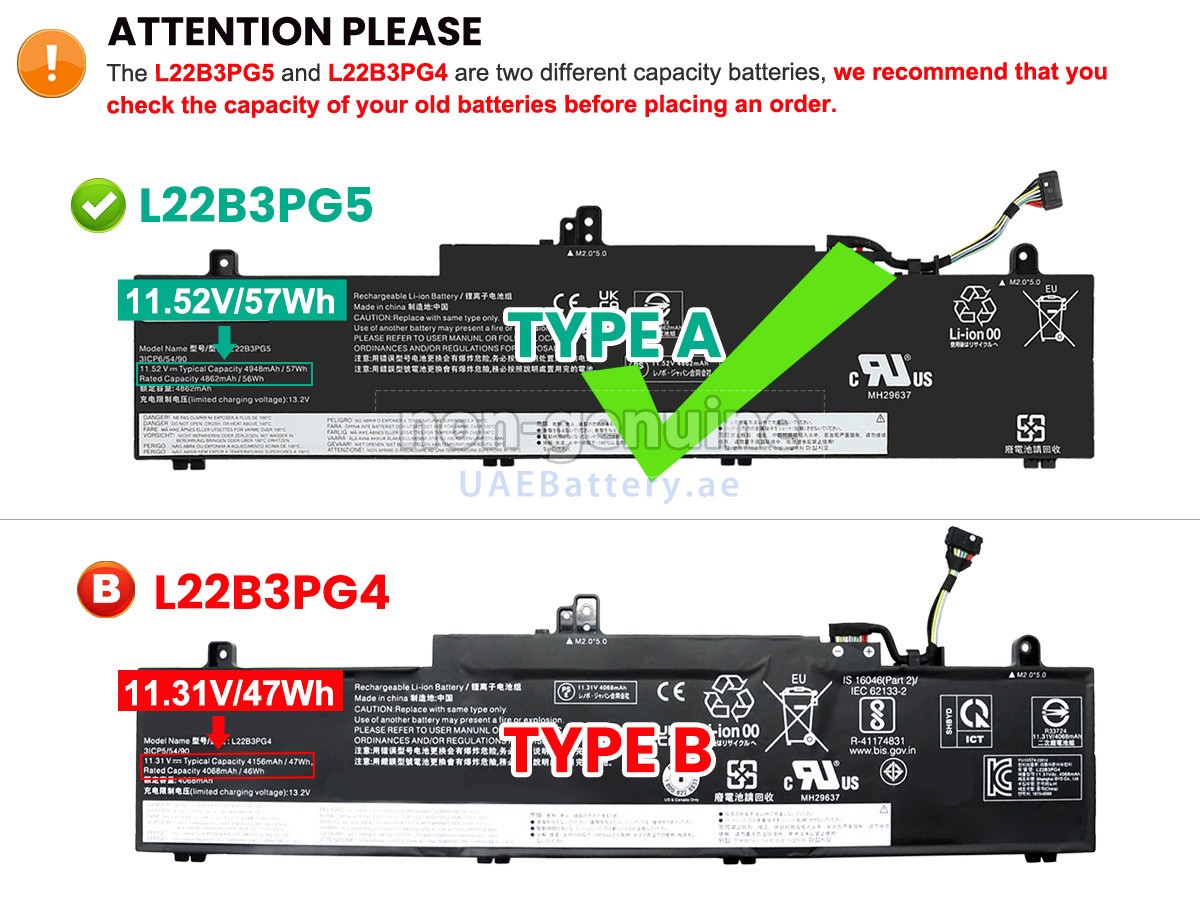 2قم بمقارنة الجهد والسعة للبطارية مع بطارية Lenovo ThinkPad E16 GEN 1-21JN00B9AD، وتحقق من أن واجهة البطارية وشكلها هما نفس الصور الموجودة على موقعنا.