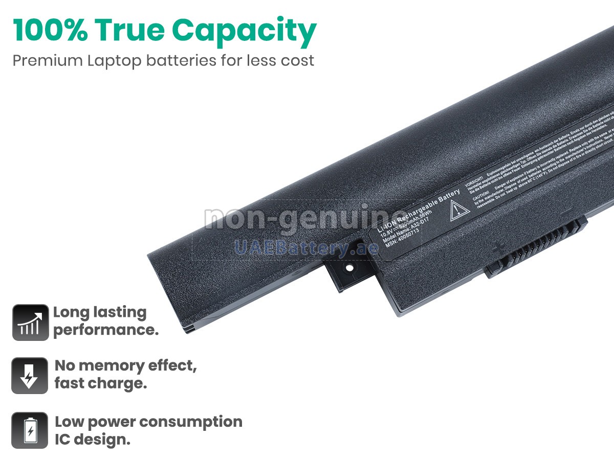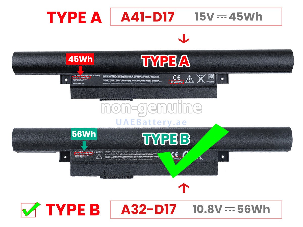 جواب: جميع البطاريات التي تباع على UAEBattery هي بطاريات مستبدل لـOEM. ويستخدم خلايا البطارية والرقائق الذكية من العلامة التجارية الأصلية، ويمكن أن تنافس أو تتجاوز البطارية الأصلية في الأداء وتجرية الإستخدام. وهكذا يتم التخلص من قسط العلامة التجارية ولا تتأثر الجودة. في الواقع، يتم أيضا عملية التجميع لبطارية A42-D17 الأصلية باستخدام ملحقات من الطرف الثالث المختلفة، وقامت بتثبيت علامتها التجارية الخاصة بها على البطارية قبل البيع فقط. ففي UAEBattery يمكنكم شراء منتجات عالية الجودة بأسعار معقولة!