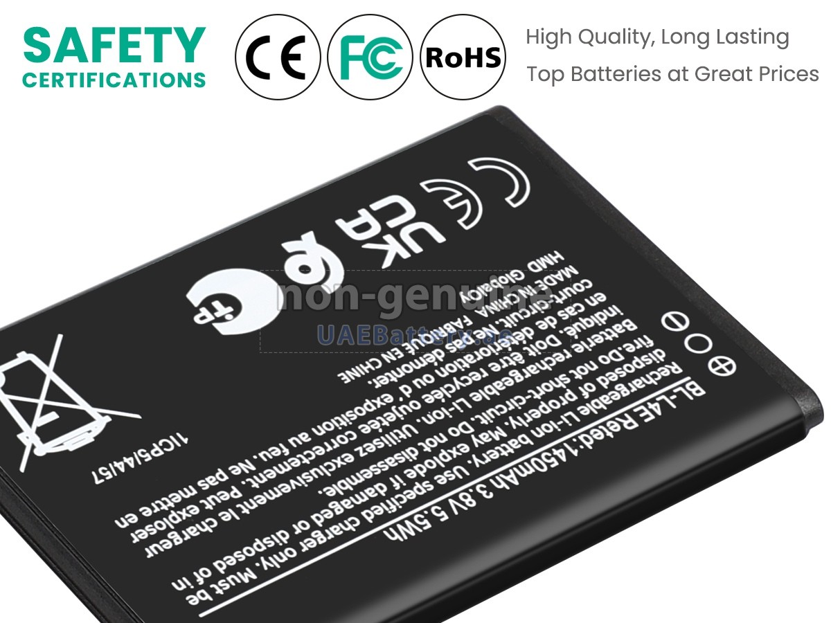 اجتازت كل بطارية Nokia 8210 4G مستبدلة سلسلة من شهادات السلامة مثل ECAS، CE، UL والخ، وبالإضافة إلى ذلك، يلزم أن تخضع لسلسلة من الإختبارات الصارمة قبل خروجها من المصنع لحماية استخدامكم الآمن!