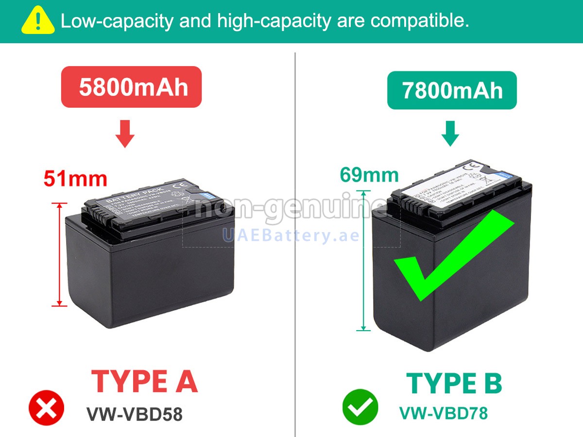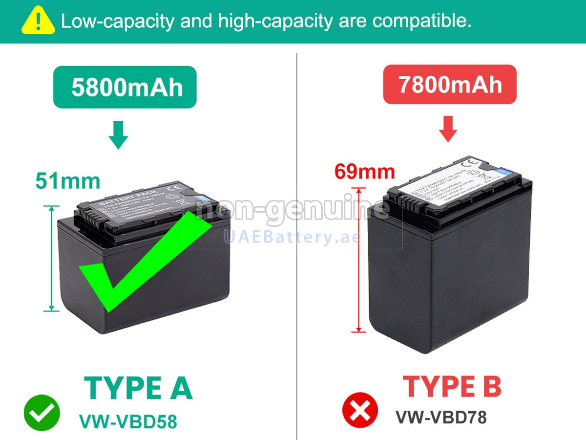 VW-VBD58/78/has capacity and size differences, can be compatible with the use of larger capacity battery will have a part of the battery bulge. 2 خلايا56.2Wh Panasonic HC-X1500